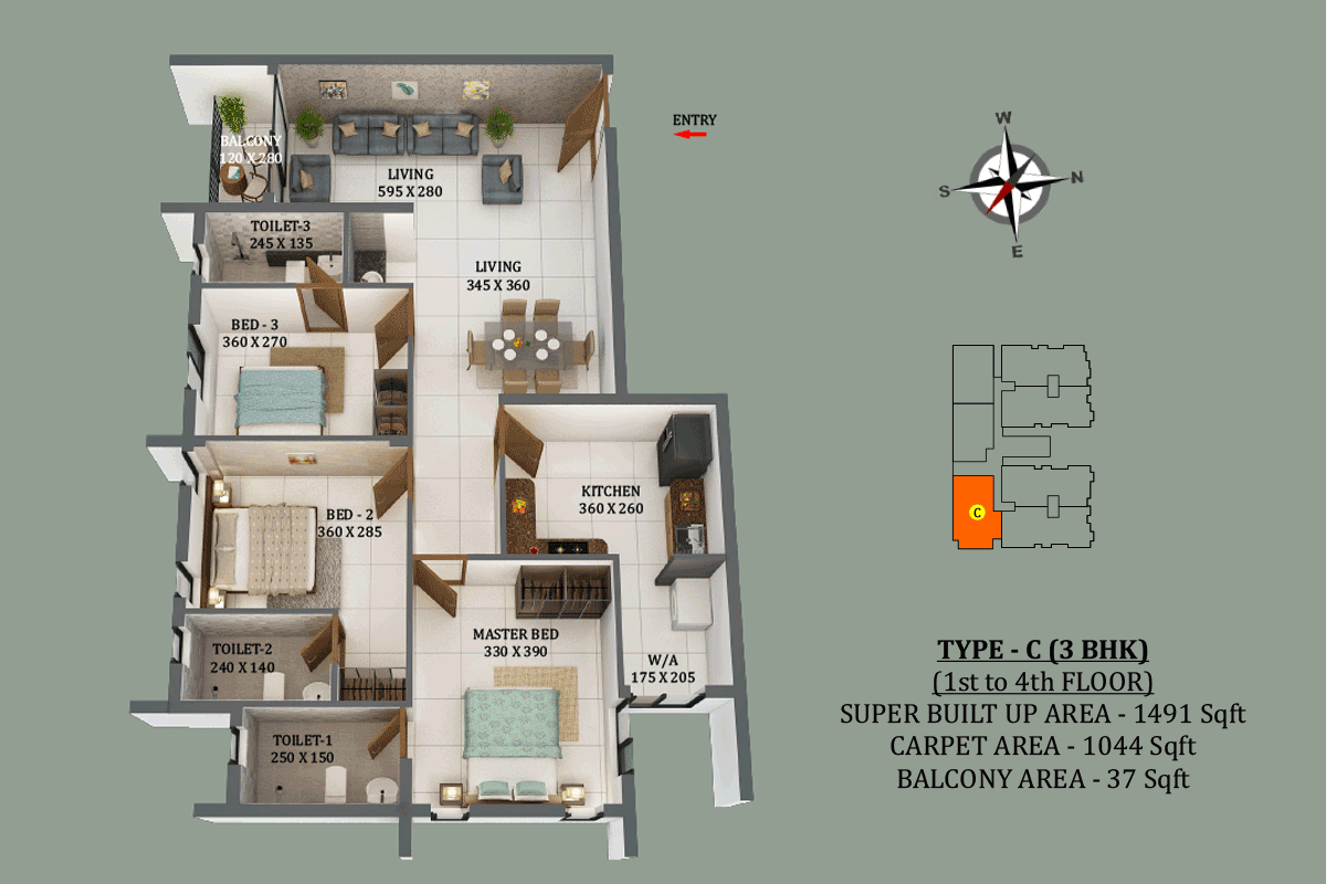 3 Bedrooms with attached bathrooms.