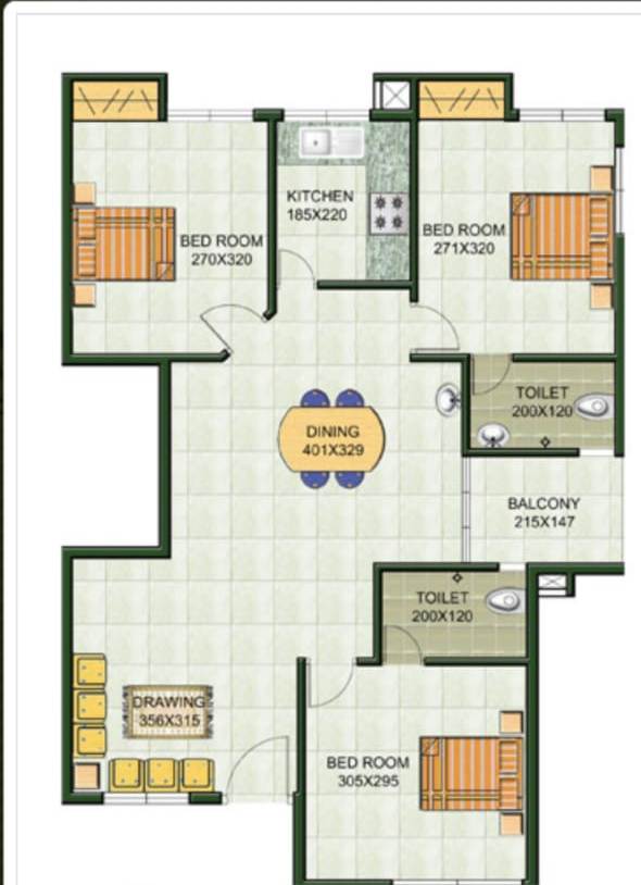 3 bedrooms with 2 attached bathrooms.