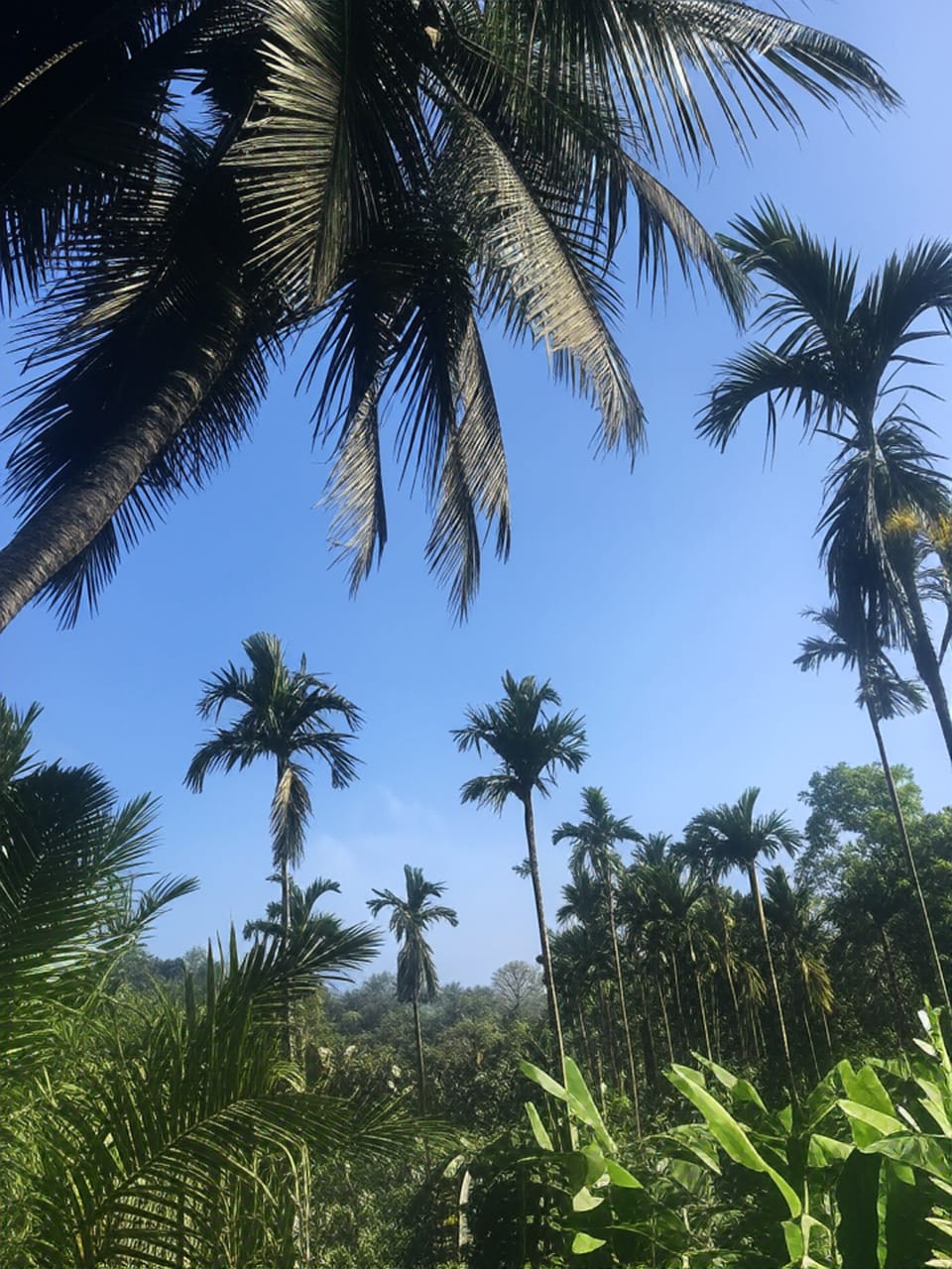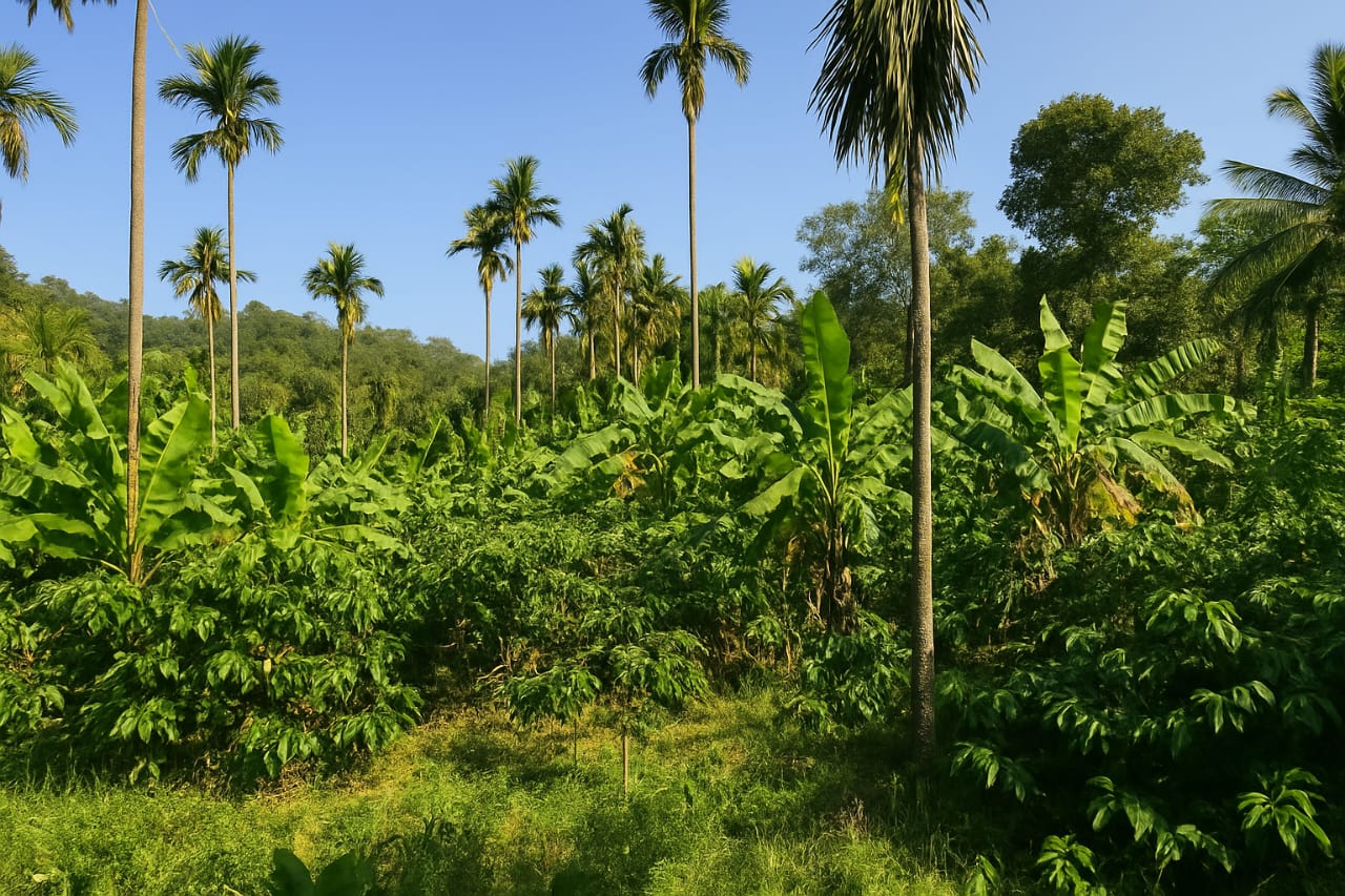 Thriving coffee plantation with mixed shade trees.